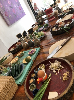 当日。午後のクラスに参加する私は13時半に指定された集合場所へ。スタッフが看板を持って立っていて、迷うことはありません。全員揃うとシェフが市場へ連れて行ってくれます。グループは8名で私の参加したクラスでは、韓国人の若い女性グループと、親子(お子さんは10歳くらいでした)でした。市場ではタイ料理に欠かせない野菜などをシェフが英語で説明してくれます。そして今日使う食材をグループのみんなで分担し、クッキングスクールに向かいます。少しイメージしていた市場ツアーとは異なる感じはしましたが、特に不満はありませんでした。