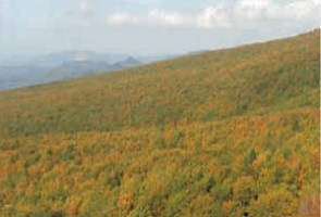 道路の大半は左右に広がるブナや白樺の枝が頭上まで覆い、晴天なのに木漏れ日程度の山道(それでも一応国道です)ですが、時折パッと視界が開け、一面黄金色に染まった田んぼや、赤や黄色のリンゴがたわわに実ったリンゴ林が続きます。昔は当たり前にあったような景色ですが、最近では目にすることもなくなった景色かもしれません。峠からの眺めは、森が色とりどりに染まり始め、見渡す限り人跡がありません。「まだこんな風景が日本にも残っていたんだなあ」と思わず呟いてしまうような、手つかずの自然そのままの景色です。