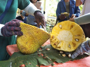 ジャックフルーツは世界最大の果実と言われその大きさにびっくりしてしまいます。長さ70cm、幅40cm、重さは40~50kgにも達することもある巨大フルーツです。匂いが少し強いですがパイナップルの酸味がない感じで甘みが強くおいしいです。