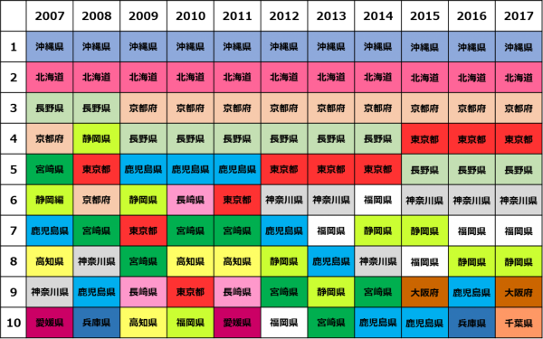 11年連続で、1位は沖縄県、2位は北海道という結果となりました。