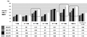 2014年と海外渡航者数がほぼ同数であった2006年実績を100%として、過去5年間の海外ロングステイ推計人口の世代別推移を見てみると、40~49歳、65~69歳、70歳以上の推計人口の伸び方は顕著である。60~64歳が過去2年間減少しているのは60歳からの雇用延長が進み、継続雇用されるシニアが増えたことを示唆している。その反動か、2012年以降の65~69歳の伸び率は突出している。(図3)