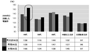同じく2006年を100%とし、2014年の40代以上の男女別ロングステイ推計人口および渡航者数と比較して見ると、渡航者数の伸率が97%と横ばいの中、40歳以上合計は132%増加している、男女別では男性127%、女性145%と女性の増加率が男性を大きく上回る結果となった。40代女性は166%と大幅な伸び率を示した。(図4)