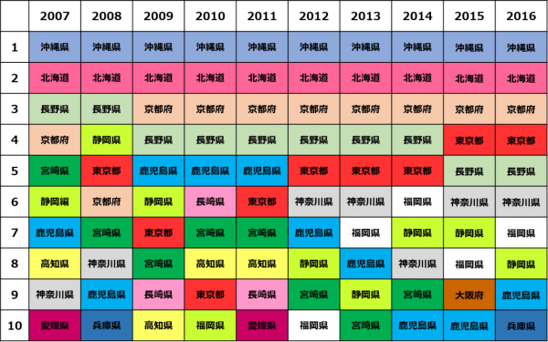 10年連続で、1位は沖縄県、2位は北海道という結果となりました。気候の良さ、避暑・避寒がロングステイの目的として人気があるため、それらを満たす都道府県が希望ロングステイ先として挙げられています。