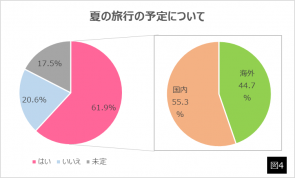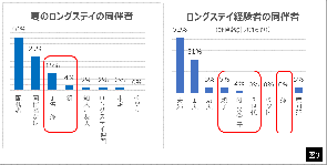 夏のロングステイの同伴者として「子供・孫」「親」と合わせて19%と、通年でのロングステイに比べ、約2.7倍になることがわかった。(図3)これは、現役世代の子供や孫の夏休みに合わせて多世代でロングステイを楽しむ層や、老親を連れ体に負担のない気候を求めてロングステイを実践といった夏のロングステイならではの新たなトレンドと当財団では分析している。