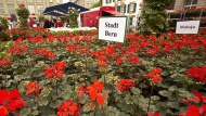 首都ベルンでは、4月下旬にゼラニウム・マーケットが開かれます。1957年から始まったベルンの旧市街で約60年続く伝統の花市です。連邦議事堂の真ん前の広場「ブンデス広場」には、ゼラニウムを中心に、さまざまなバルコニー・フラワーを準備するために多くの市民が足を運ぶ、春の風物詩となっています。約30種、約9000株のゼラニウムを含む、約1万4000株の美しい花々が早朝から連邦議事堂前の広場に並びます。家々の窓や玄関などを彩るゼラニウム。スイスを代表する花風景のひとつですが、とくに世界遺産に指定されているベルン旧市街に残る歴史的な石造りの建物や装飾的な泉に飾られた花の色がよく映え、ゼラニウムの町としても有名です