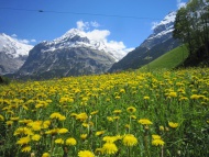 標高1030mのグリンデルワルト村では、雪が融けるといっぺんに春の装いに変わります。一番先に咲く花はクロッカスで、白色と紫色があります。その次は西洋タンポポです。黄色のタンポポがまるで絨緞のように一面に咲き乱れます。村内の牛小屋に冬の間中いた牛たちが、春の陽気に誘われるように屋外に出てきて、まずはこの西洋タンポポや新緑の牧草を美味しそうに食べます。標高が上がるにしたがって、高山植物が徐々に顔を出してきます。青色のプルサティラ・ハレリ(キンポウゲ科)、ゲンティアナ・ベルナ(春リンドウ)、白いセイヨウミミナグサ、黄色のキンポウゲ、プリムラ・ペリスなど多くの草花が咲き始めます。