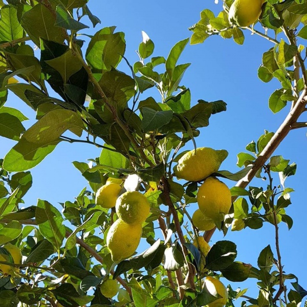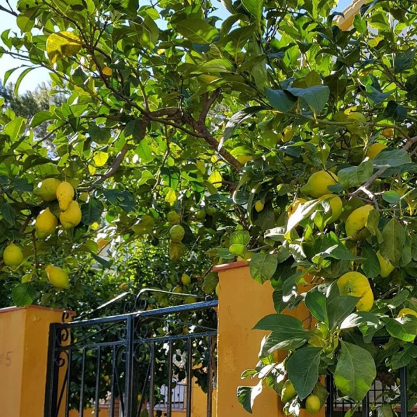 「うわあ、街路樹がレモン。」このお家もレモンだらけ。たわわに実っています。