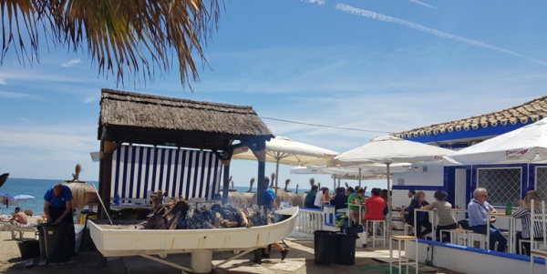 コスタデルソルではビーチ沿いにこうした海の家的なレストラン「チリンギート」がたくさんあります。写真のボートの中では串に刺したイワシを炭火で焼いています。これが当地人気のEspeto de Sardinaです。ビールとの相性は抜群。リラックスしたムードでしょう。