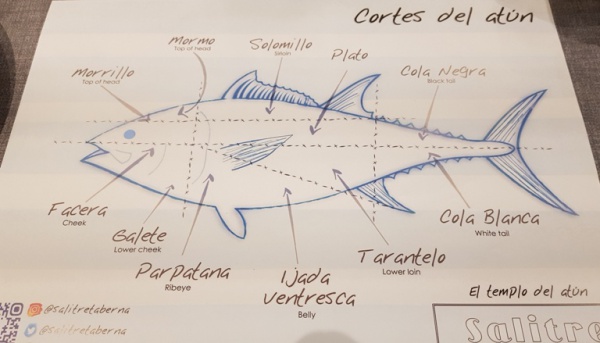 マグロもこれからシーズンに入ります。Atunと呼ばれるのですが、最近は生で食べるのもかなりポピュラーです。以前はどの部位も同じ値段だったのですが、このようにちゃんと部位分けがされています。中トロ、大トロの部位は割高です。マグロのステーキだけでなく、たたき(Tartar)とかモロッコ風の串焼き(Pinchito)などお料理のバリエーションも豊富。