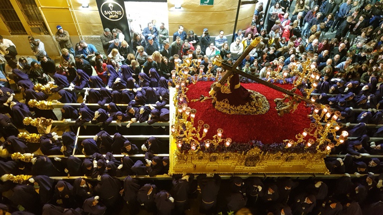 キリストが捉えられ磔刑に処され、復活するまでのシーンが輿のテーマになっています。死の金曜日に向かってムードが高まっていくわけです。一つの教会からイエス様とマリア様、2つの輿が出ます。通常は教会内に安置されている像を担いでこのようにパレードをしながら運ぶのです。ひとつの輿に200人近い担ぎ手がつきます。一晩に十輿以上のTornoが深夜まで街中を練り歩きます。事前にルート行程表と地図が出るのでそれを片手にこれらのTornoを追いかけて参観します。真夜中のマラガはすごい人出で、この期間は電車も深夜運行。