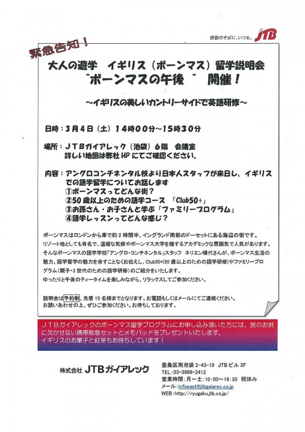 イギリス南部の海辺の街ボーンマスから語学学校アングロコンチネンタルの日本人スタッフが来日し、50歳以上のための英語コースや学生生活についてご説明します。イギリスの紅茶とお菓子もお楽しみください。 |